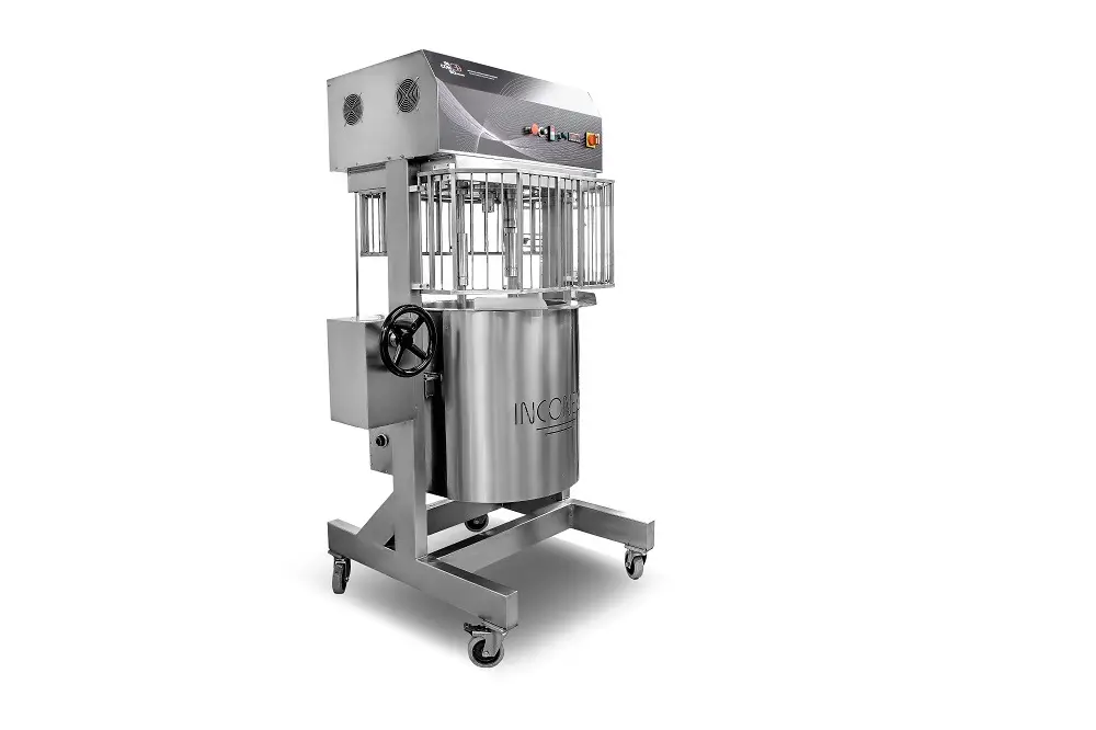 Das Bain-Marie-Konzept basiert auf der Verwendung von thermischem Öl in den Eimerwänden und bietet so eine sichere und einfache Bedienung. Die Kessel verfügen über eine rotierende Planetenbewegung aus zwei Werkzeugen, dem Draht und dem Schaber, die am Ende der Verarbeitung zusammenwirken, um eine perfekt homogene Mischung zu erzeugen.