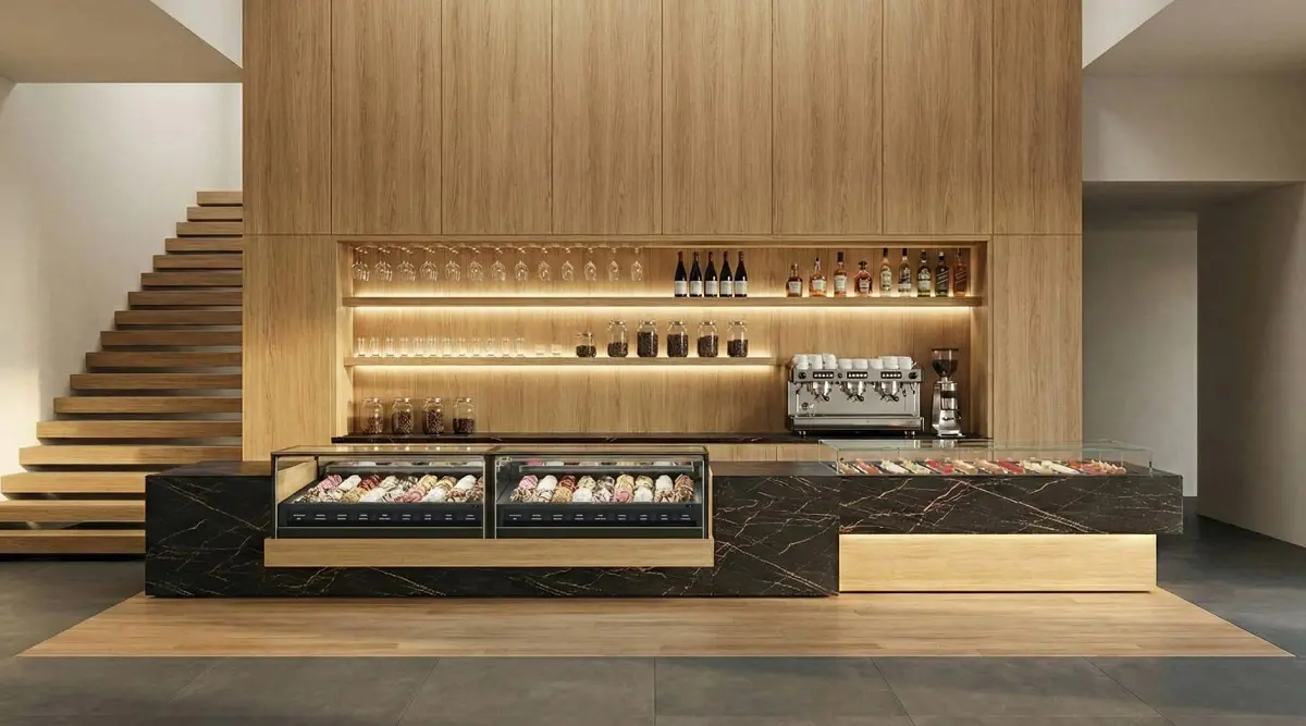 Im neuen Delice Gelato-Service ist das Wichtigste der großzügige Ausstellungsraum Dank der verbesserten LED-Beleuchtung, dem hochtransparenten Glasrahmen und der Oberfläche in weißem, schwarzem oder Edelstahl passen Ihre Produkte harmonisch in die Delice-Reihe und sorgen für visuelle Kontinuität im gesamten Raum.