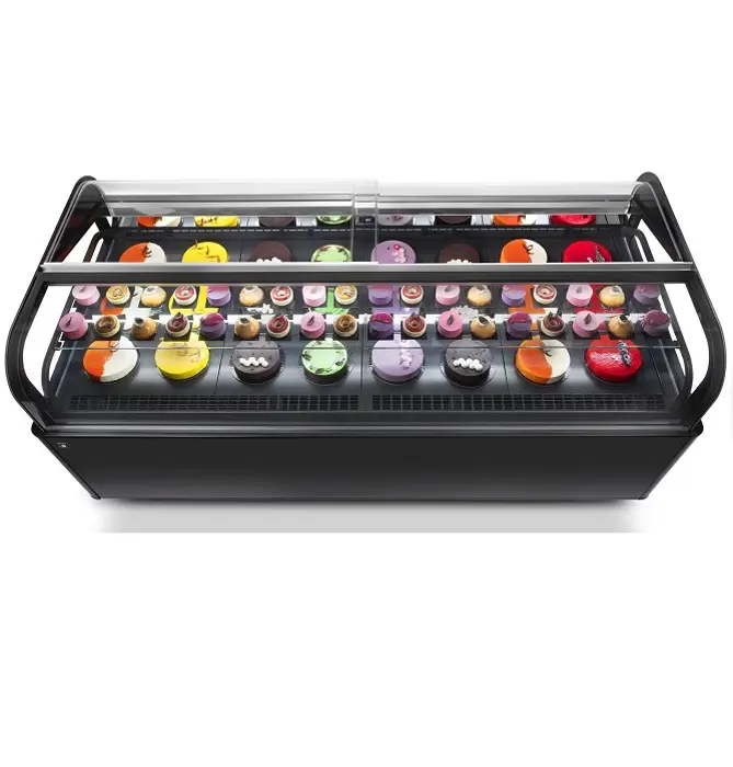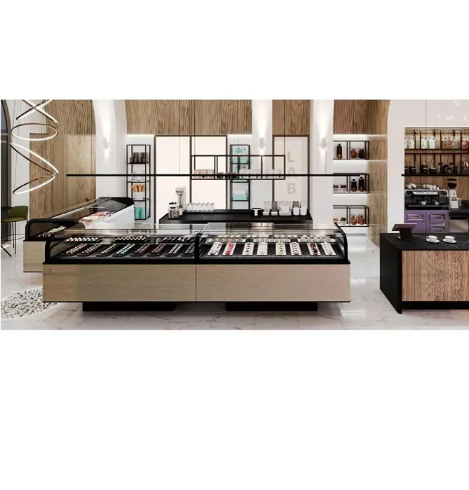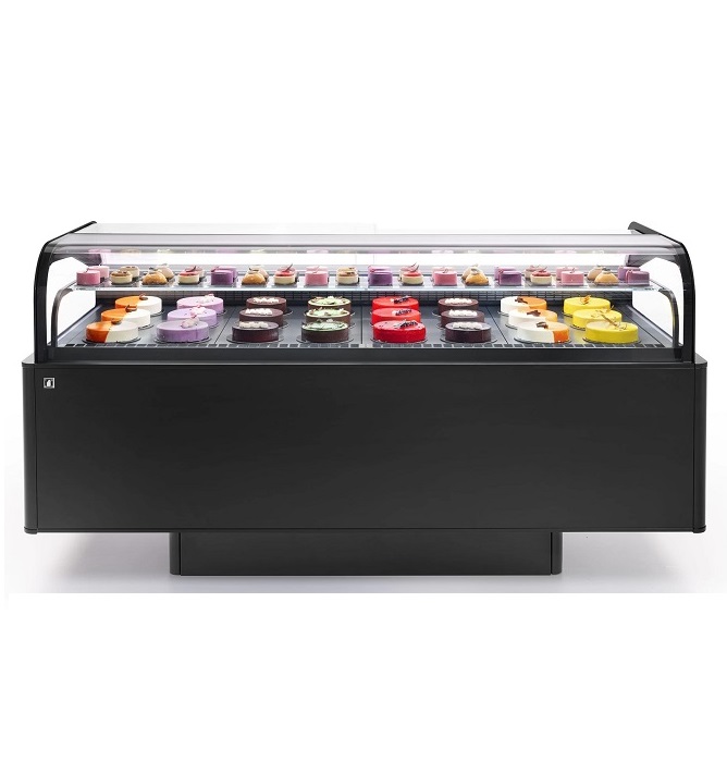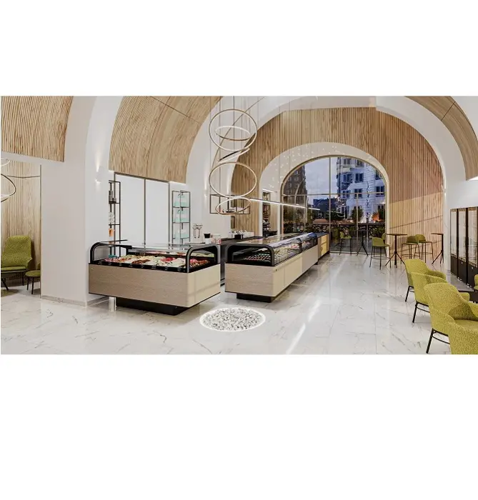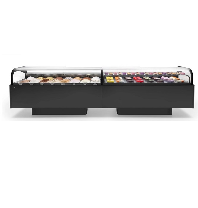 • Extensive aesthetic customization: two types of base and a wide range of aesthetic finishes, both for the interior and exterior of the display case.• Possibility of integration with Hybrid Cooling Technology.• Services: Gelato, Gelato/Pastry, Pastry and Praline.